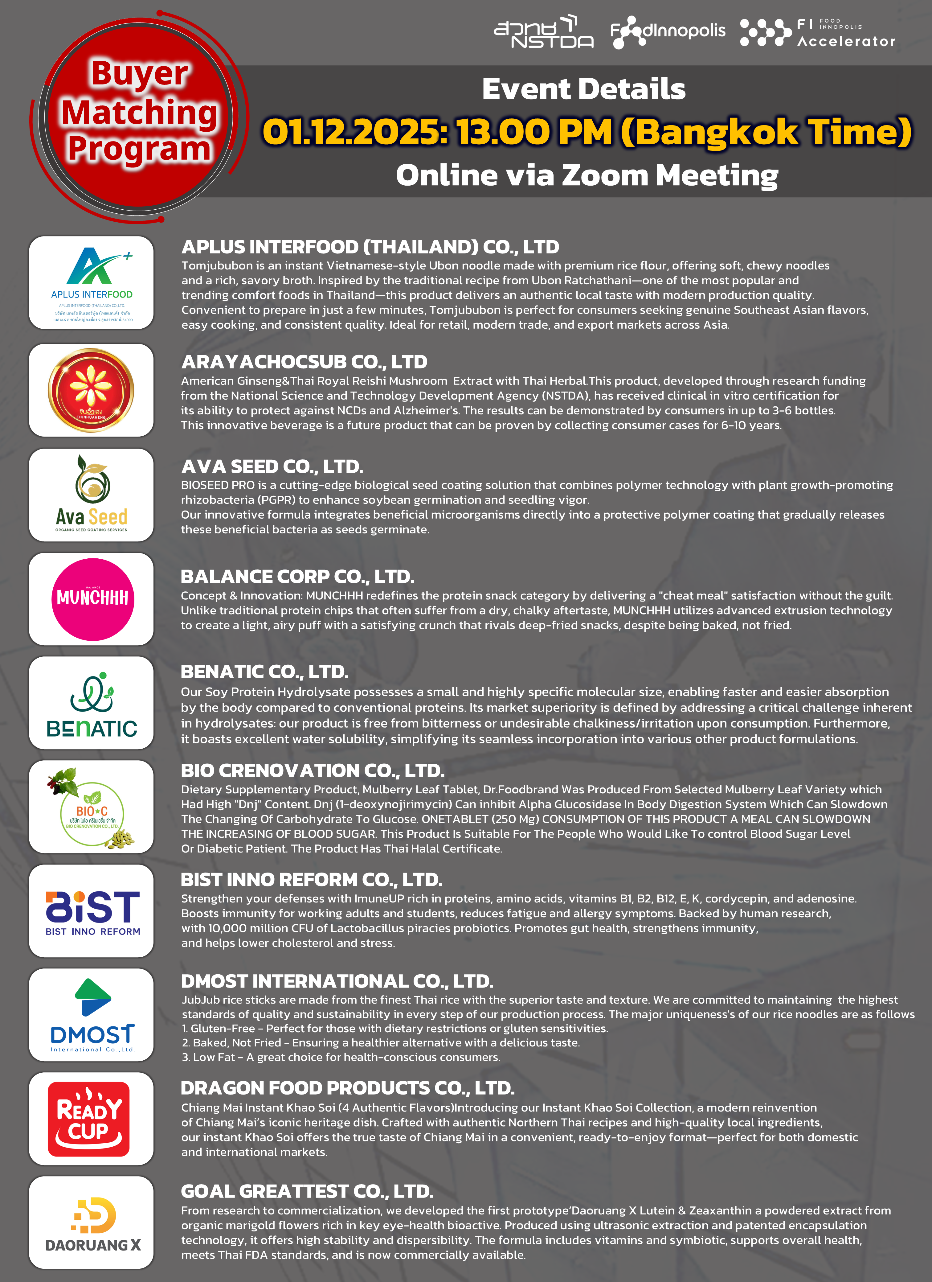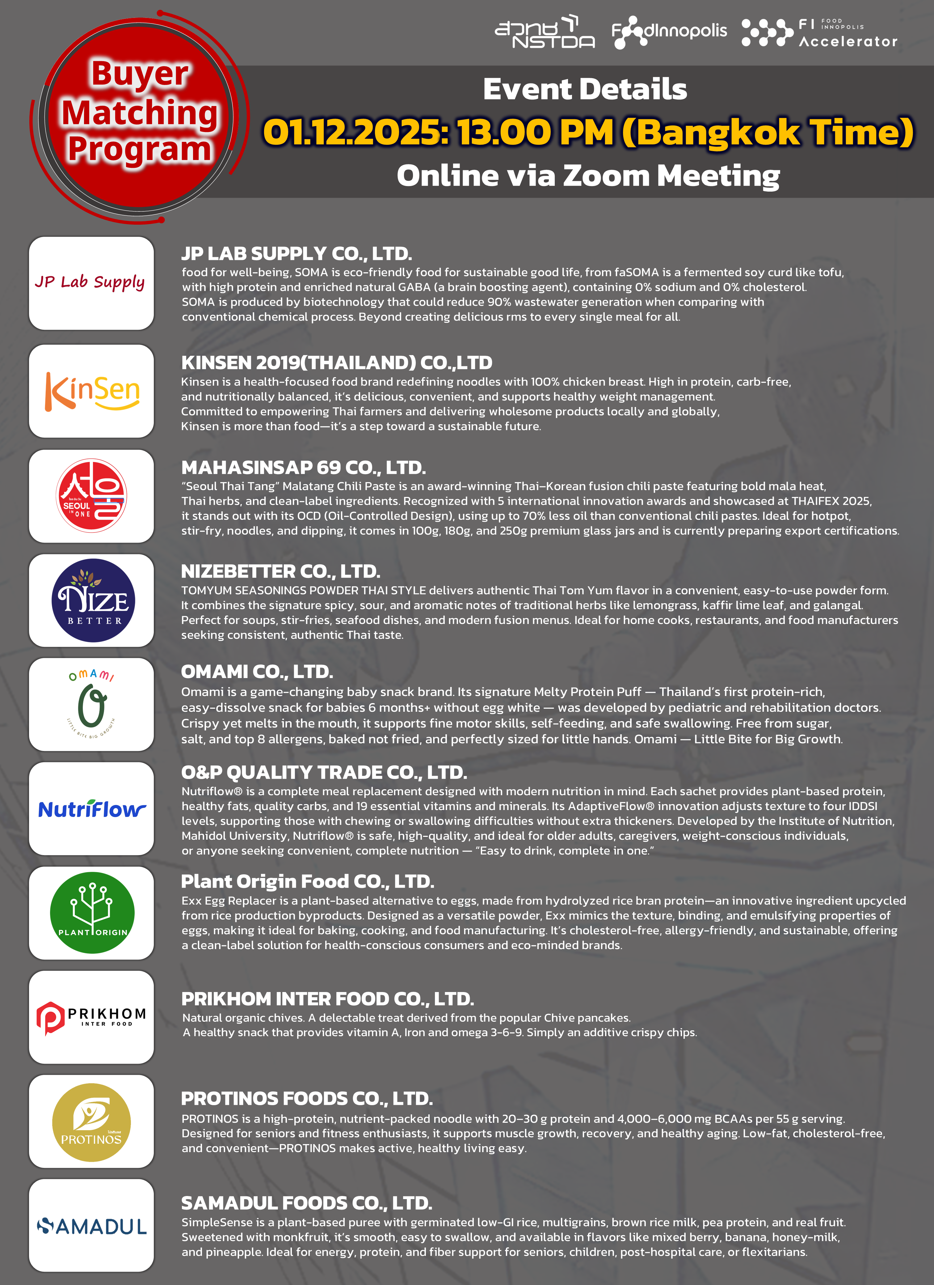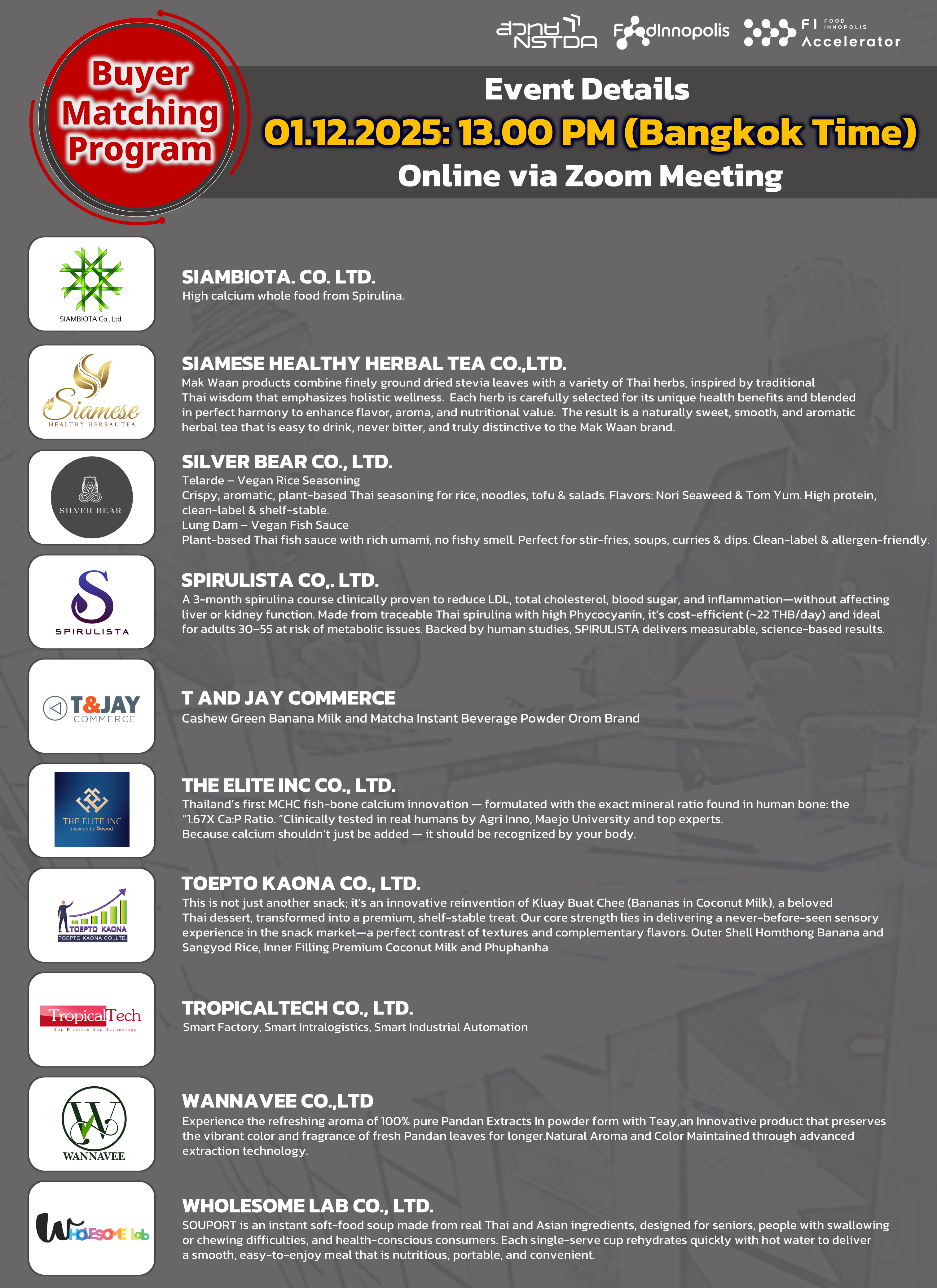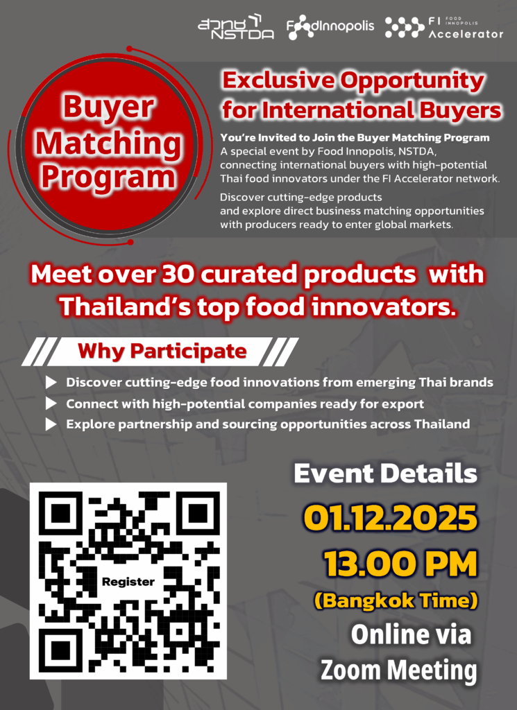 You’re Invited to Join the Buyer Matching Program A special event by Food Innopolis, NSTDA, connecting international buyers with high-potential Thai food innovators under the FI Accelerator network.