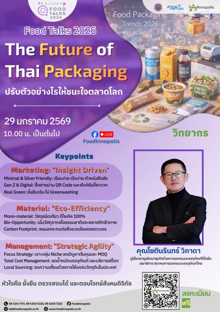 ในสัปดาห์สุดท้ายของ Food Talks 2026 เราจะพาคุณมามอง “บรรจุภัณฑ์” ให้ไกลกว่าแค่ความสวยงาม แต่เป็นเครื่องมือเชิงกลยุทธ์ที่เชื่อมโยง การตลาด การเลือกใช้วัสดุ และการบริหารจัดการต้นทุน เพื่อสร้างความได้เปรียบในการแข่งขัน ตอบโจทย์ผู้บริโภคยุคใหม่ และต่อยอดธุรกิจอาหารให้เติบโตอย่างยั่งยืนในตลาดโลก กับหัวข้อ Food Talks 2026 | The Future of Thai Packaging ปรับตัวอย่างไรให้ชนะใจตลาดโลก 📦✨
