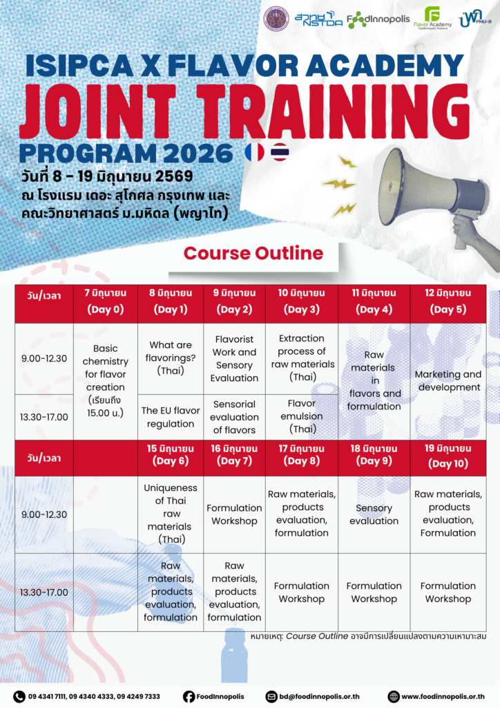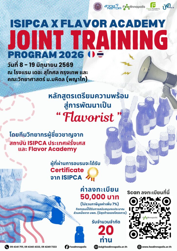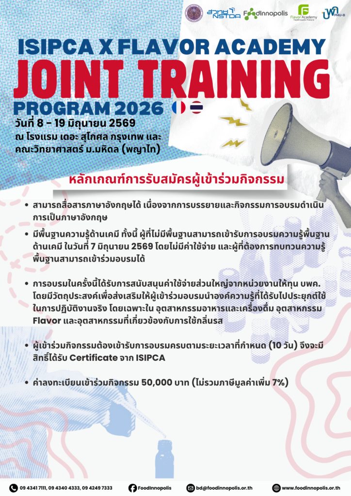 🚩 Flavor Academy โดย Food Innopolis สวทช. ร่วมกับสถาบัน ISIPCA ประเทศฝรั่งเศส เชิญผู้ที่สนใจเข้าร่วมอบรม “Joint Training Program 2026” หลักสูตรพื้นฐานที่จำเป็นด้านกลิ่นรส เหมาะสำหรับผู้ที่ทำงานในอุตสาหกรรมกลิ่นรส หรือต้องการเตรียมความพร้อมสู่การเป็น Flavorist ในอนาคต