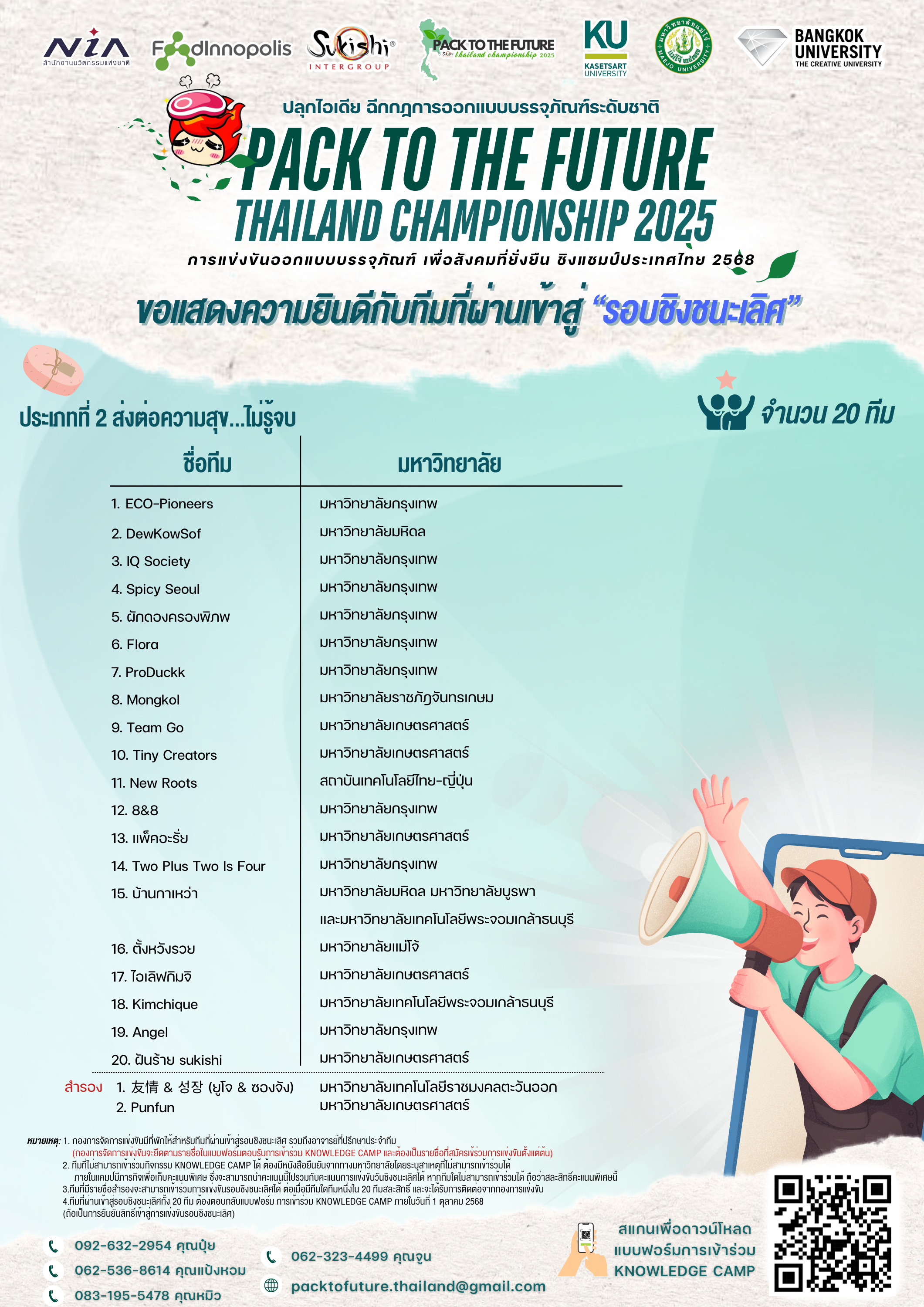 👉 ทีมที่ผ่านเข้าสู่รอบชิงชนะเลิศ ให้ส่งแบบฟอร์มตอบรับการเข้าร่วม Knowledge Camp กลับมาภายใน 1 ตุลาคม 2568