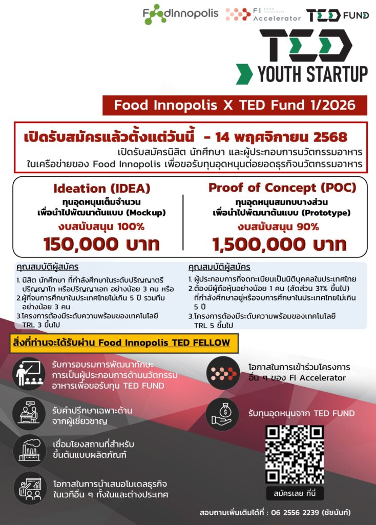 ประกาศรับสมัคร Food Innopolis “TED Youth Startup” ประจำปี 2569 ครั้งที่ 1-2569