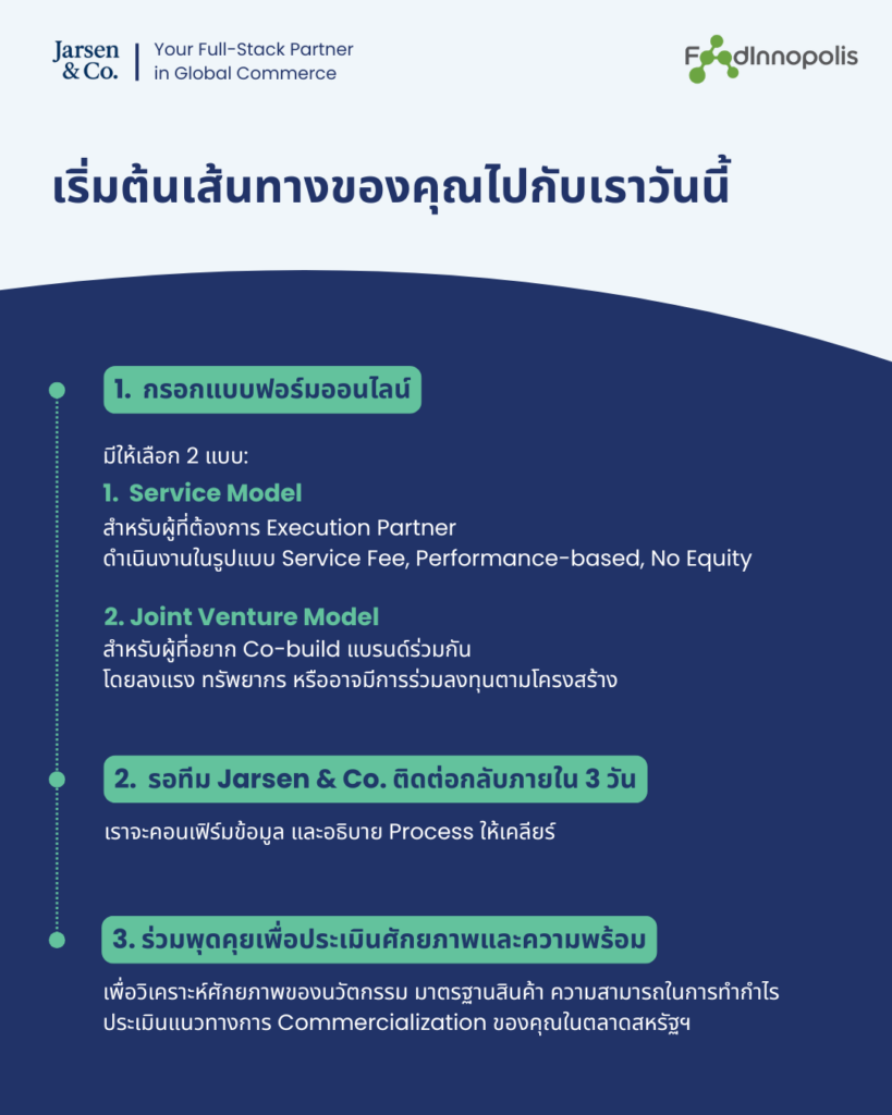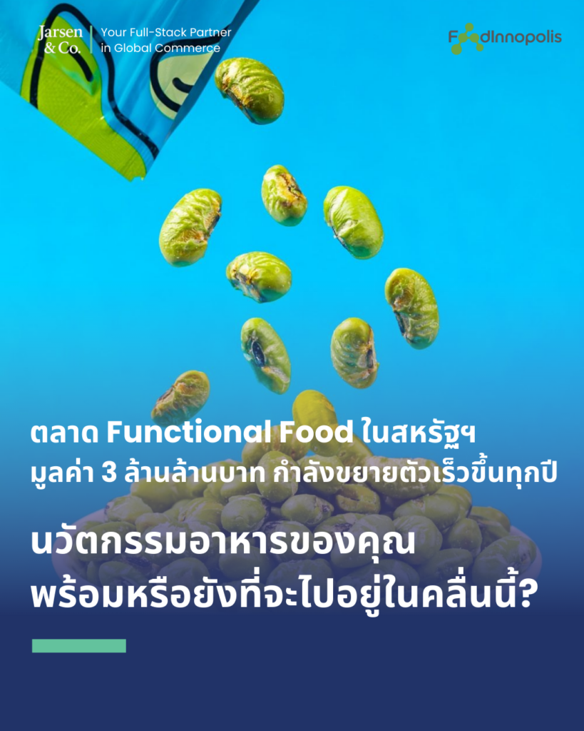 โครงการความร่วมมือระหว่าง Jarsen & Co. (Your Full-Stack Partner) และ FoodInnopolis มุ่งเน้นการนำผลิตภัณฑ์ Functional Food ที่มีศักยภาพของไทยเข้าสู่ตลาดสหรัฐอเมริกา ซึ่งเป็นตลาดที่เติบโตอย่างรวดเร็วถึง 7 – 12 % ต่อปี และมีมูลค่ามหาศาลกว่า 3 ล้านล้านบาท!