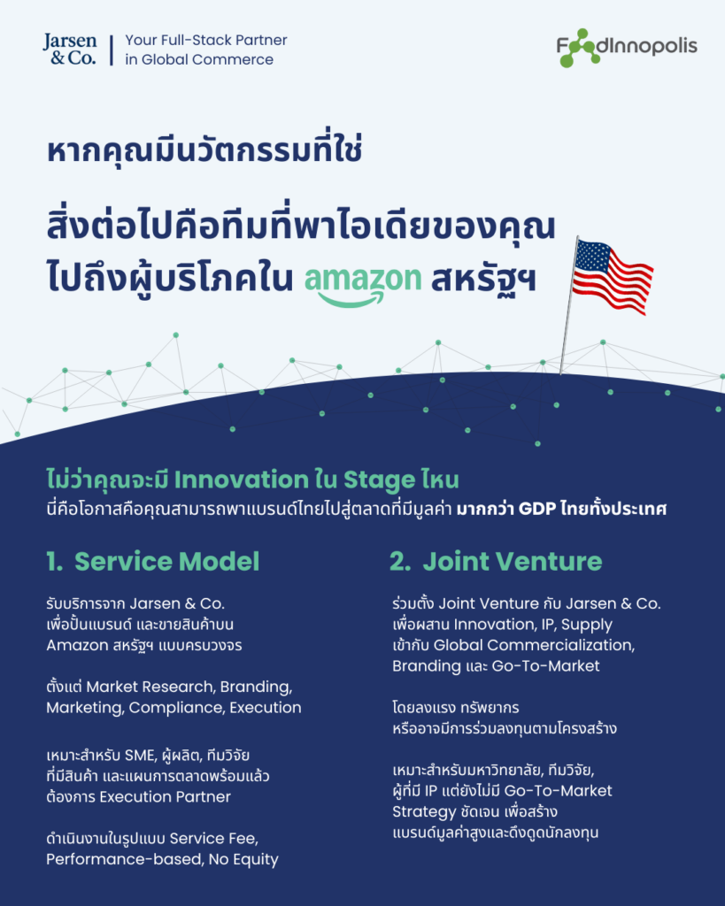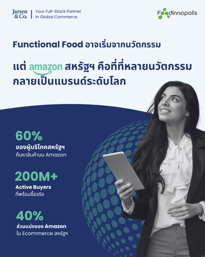เรากำลังมองหาผู้ประกอบการและนักวิจัยที่มีนวัตกรรม Functional Food ที่ใช่ เพื่อร่วมเดินทางสู่ความสำเร็จในตลาด Amazon สหรัฐฯ