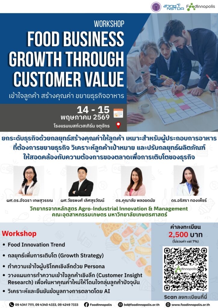 🔥 สวทช โดย เมืองนวัตกรรมอาหาร ขอเชิญผู้สนใจเข้าร่วม กิจกรรมอบรมเชิงปฎิบัติการ Food Business Growth through Customer Value เข้าใจลูกค้า สร้างคุณค่า ขยายธุรกิจอาหาร