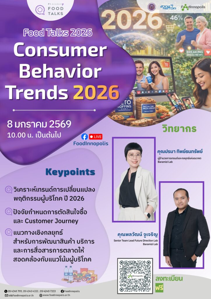 📍 เมืองนวัตกรรมอาหาร สวทช. ขอเชิญผู้ประกอบการและท่านที่สนใจมาร่วมอัปเดตเทรนด์ผู้บริโภคแห่งปี 2026 ไปพร้อมกัน!