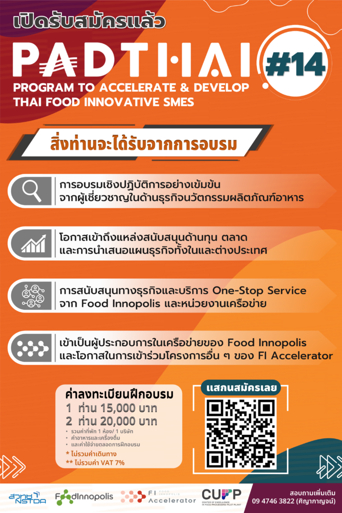 ✅ เป็นผู้ประกอบการ “ผลิตภัณฑ์นวัตกรรมอาหาร” หรือผู้ประกอบการที่มีแนวคิดในการพัฒนานวัตกรรมผลิตภัณฑ์อาหาร เพื่อสร้างตลาดใหม่ทั้งในและต่างประเทศ