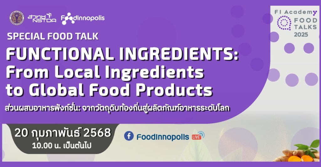 สวทช. โดย เมืองนวัตกรรมอาหาร (Food Innopolis) ขอเรียนเชิญผู้ประกอบการ นักวิจัยและผู้ที่สนใจ ฟังบรรยายในกิจกรรม “Special Food Talks 2025 – FUNCTIONAL INGREDIENTS: From Local Ingredients to Global Food Products ส่วนผสมอาหารฟังก์ชั่น: จากวัตถุดิบท้องถิ่นสู่ผลิตภัณฑ์อาหารระดับโลก” มาร่วมรับฟังความรู้เกี่ยวกับ Functional Ingredients การพัฒนาสารสกัดจากพืชท้องถิ่นและผลิตภัณฑ์อาหารฟังก์ชั่นด้วยเทคโนโลยีต่าง ๆ พร้อมทั้งตัวอย่างการศึกษาวิจัยเกี่ยวกับ สารสกัดข้าวก่ำดำเสริมฤทธิ์สารสกัดชาเขียวเพื่อการชะลอวัย และสารสกัดเสริมฤทธิ์ระหว่างชาเขียวและขมิ้นชันในการต้านมะเร็งลำไส้โดยทีมผู้เชี่ยวชาญจาก คณะอุตสาหกรรมเกษตร มหาวิทยาลัยเชียงใหม่ และ วิทยาลัยเทคโนโลยีและสหวิทยาการ มหาวิทยาลัยเทคโนโลยีราชมงคลล้านนา